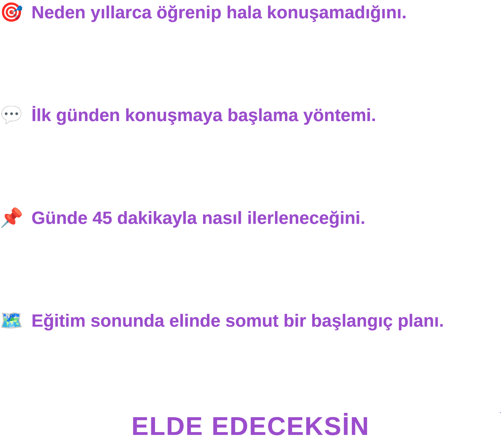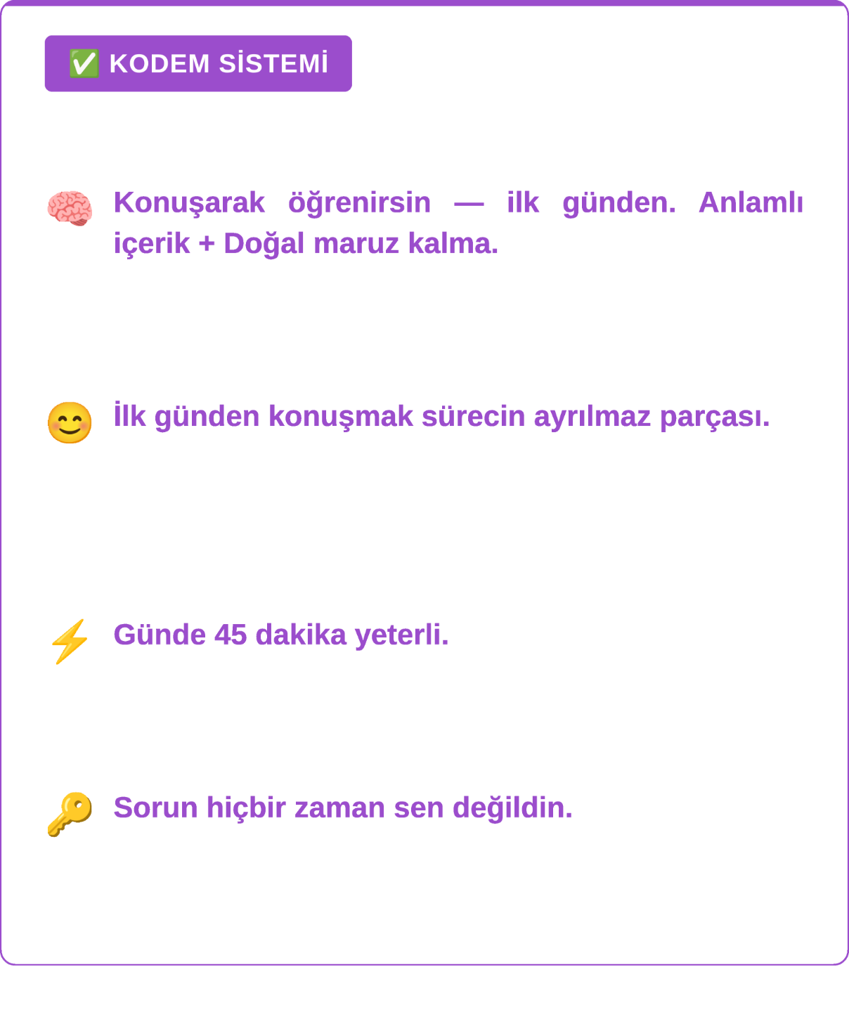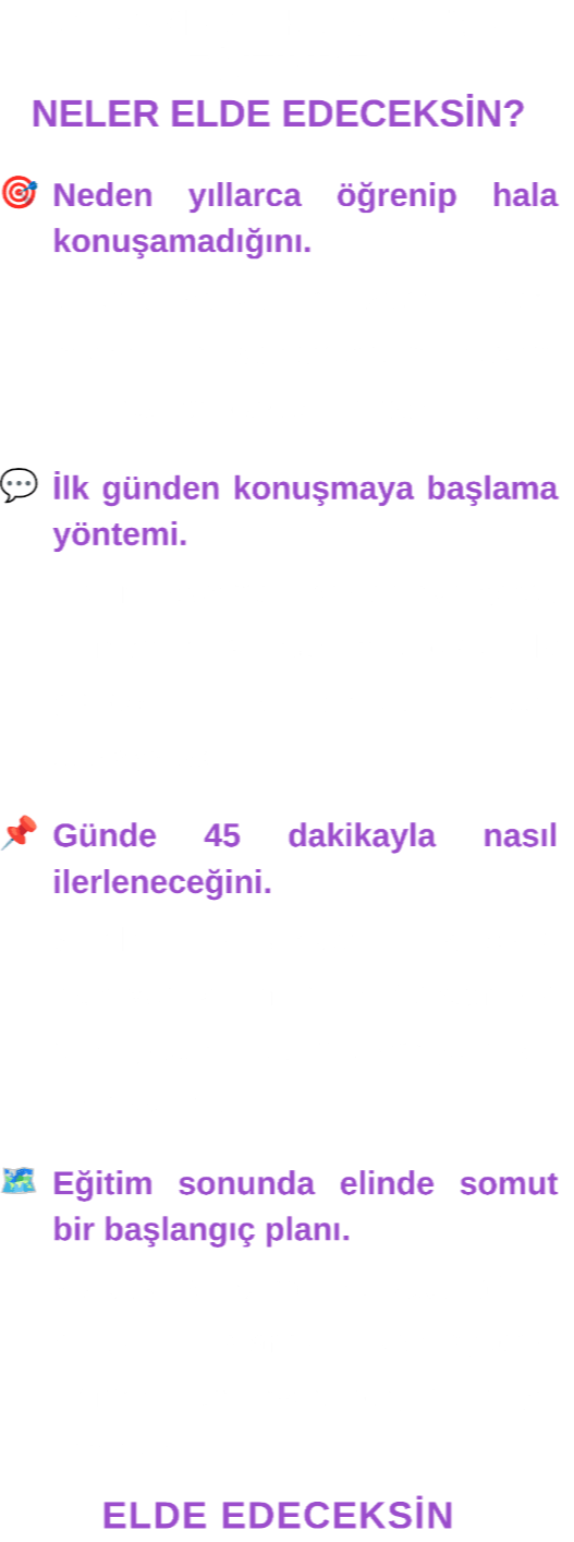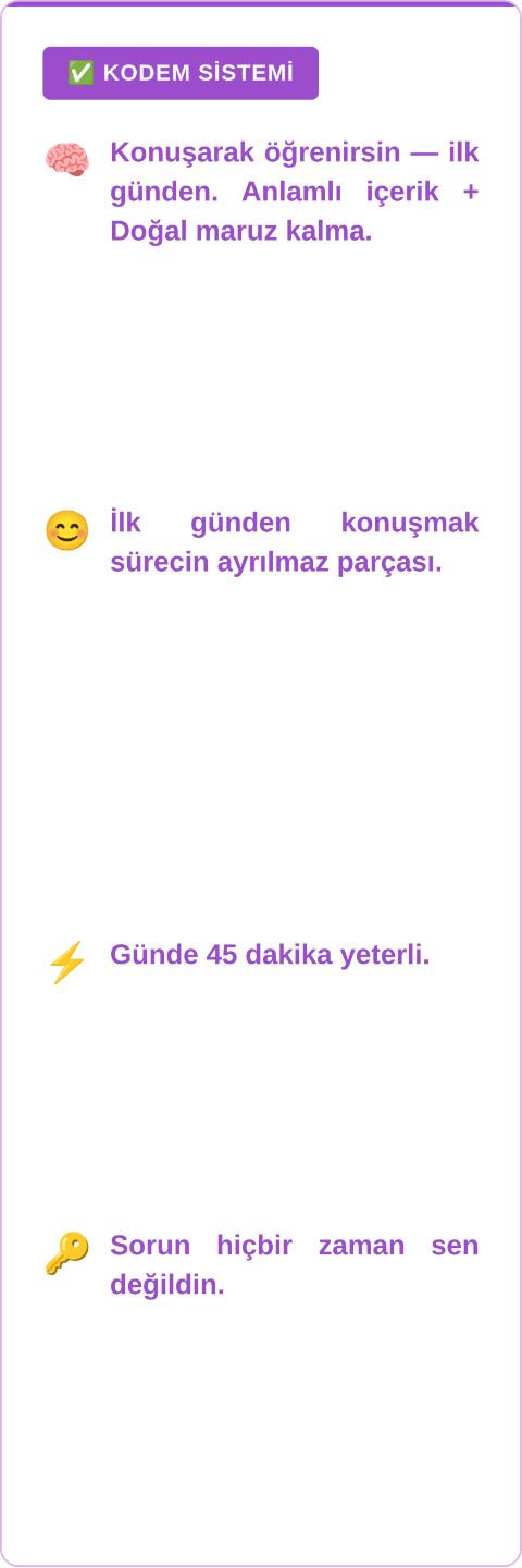 Kelime ve gramer ezberlemeden, kurslara bağımlı kalmadan binlerce kişiyi akıcı konuşturan KODEM sistemini, ücretsiz eğitimde uygulayarak ilk günden konuşmaya başla.
